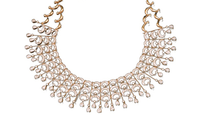 The necklaces in this category are made of gold and studded with a variety of diamonds and precious stones. |